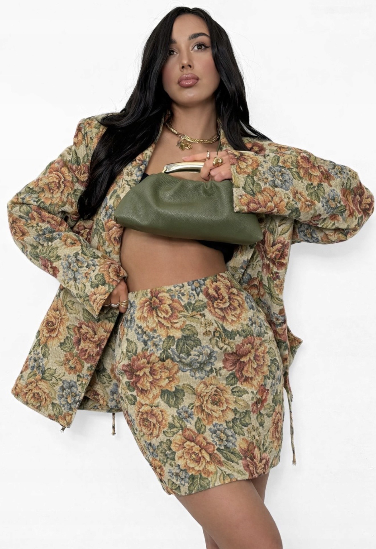 Spódnica doskonale komponuje się z marynarką Rosalia, tworząc stylowy zestaw, i świetnie sprawdzi się zarówno w casualowych, jak i eleganckich stylizacjach.